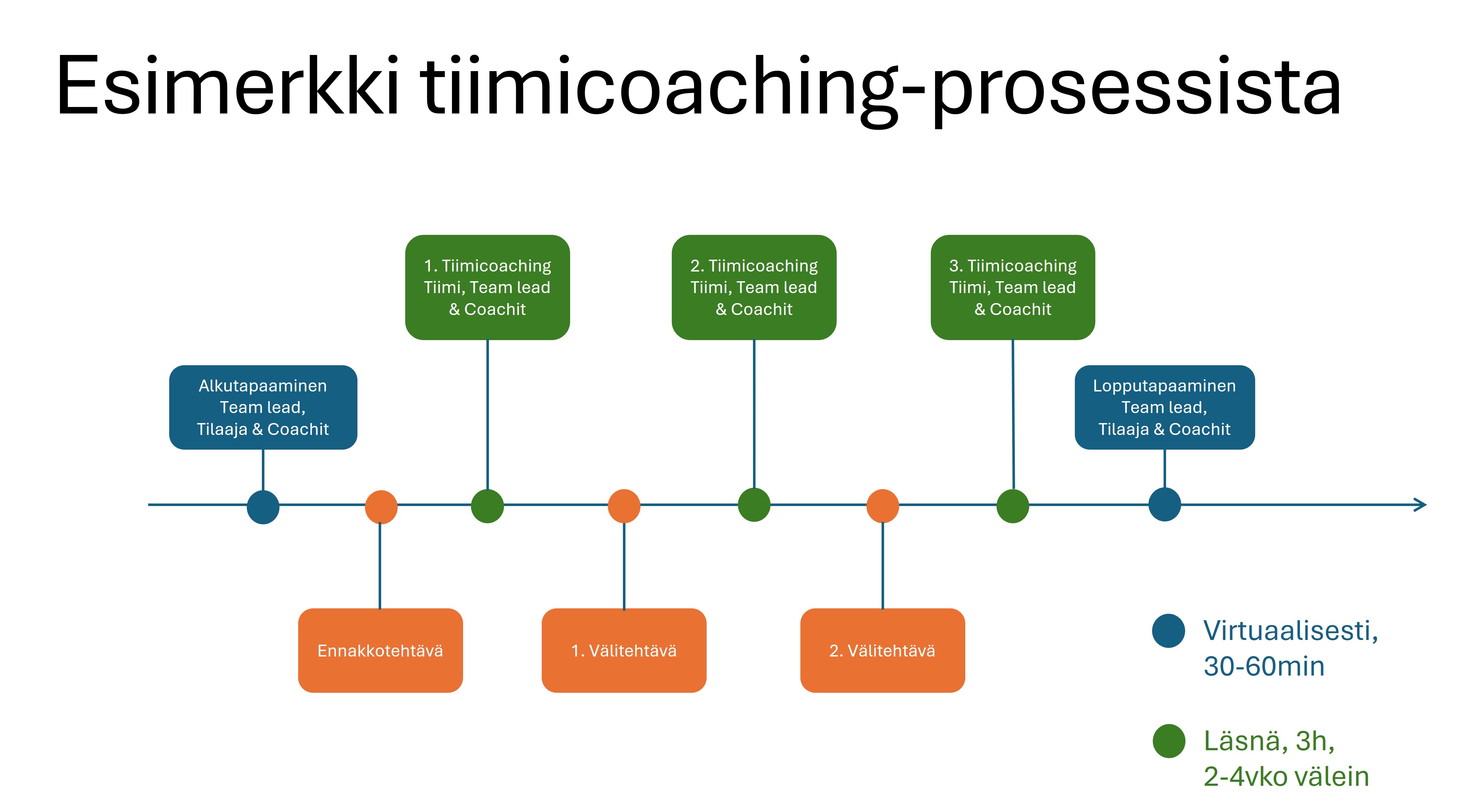 Tiimicoaching-prosessi sisältää alkutapaamisen, itse tiimin valmennukset (3kpl tai useampi) sekä lopputapaamisen.