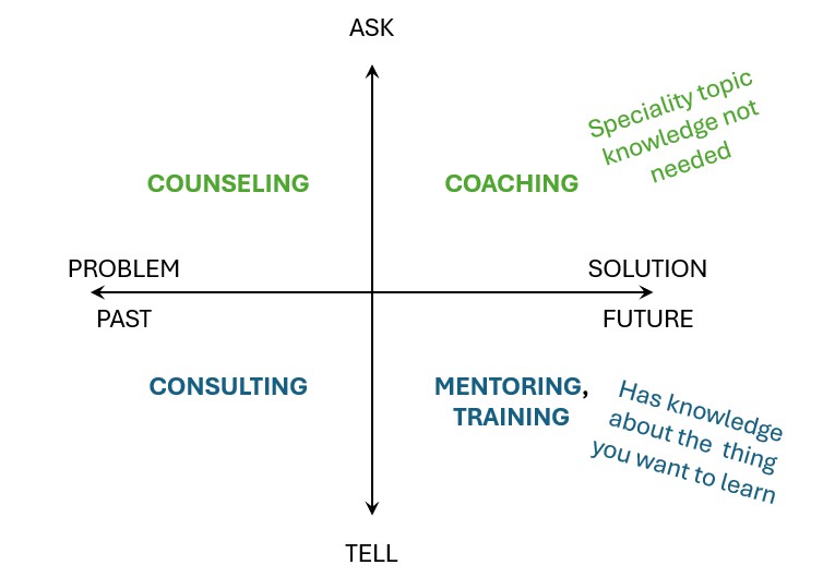 Coaching ei ole terapiaa, vaikka sillä voikin olla terapeuttisia vaikutuksia. Mistä sitten tietää mikä on terapiaa, mikä coachingia entä sitten vielä mentorointi ja koulutus? Terapiassa keskitytään menneisyyteen ja ongelmiin ja terapeutti auttaa asiakasta löytämään ratkaisuja. Konsultoinnissa ollaan myös mahdollisesti menneessä ajassa ja ongelmissa mutta erona on se, että konsultti kertoo ratkaisuja asiakkaalle. Mentorointi ja kouluttaminen keskittyvät ratkaisuihin ja konsultoinnin tavoin asiakas saa valmiita vastauksia. Sitten kun mennään puhtaaseen coachingiin, niin asiakasta autetaan kysymyksillä löytämään itse omat vastaukset ja keskitytään ratkaisuihin ja tulevaisuuteen.